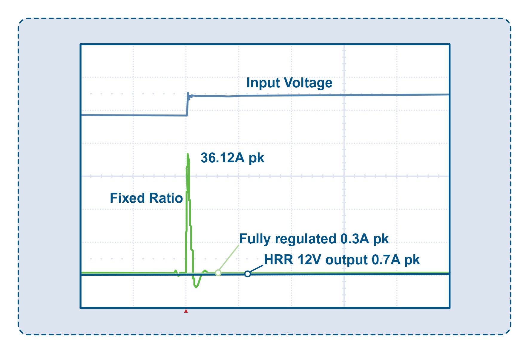 With the HRR converter, the capacitor charging current is just 0.7A, which compares well with the charge current of 0.3A for the fully regulated fixed-output converter. This is one of the important benefits of HRR. The PKU-D HRR products from Flex Power Modules actually have a constant current characteristic on overload, with shutdown and restart if the overload persists.